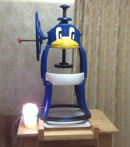 かき氷機を購入した時、脚が黒色、上が水色。 涼しげな色ではあるものの、かわいらしさはないデザインでした。 かわいさと夏らしさとが欲しかったオヤジは、ペンギンの絵を描くことにしました。 長い時間をかけてたどり着いたデザインがこれです。 上から青…