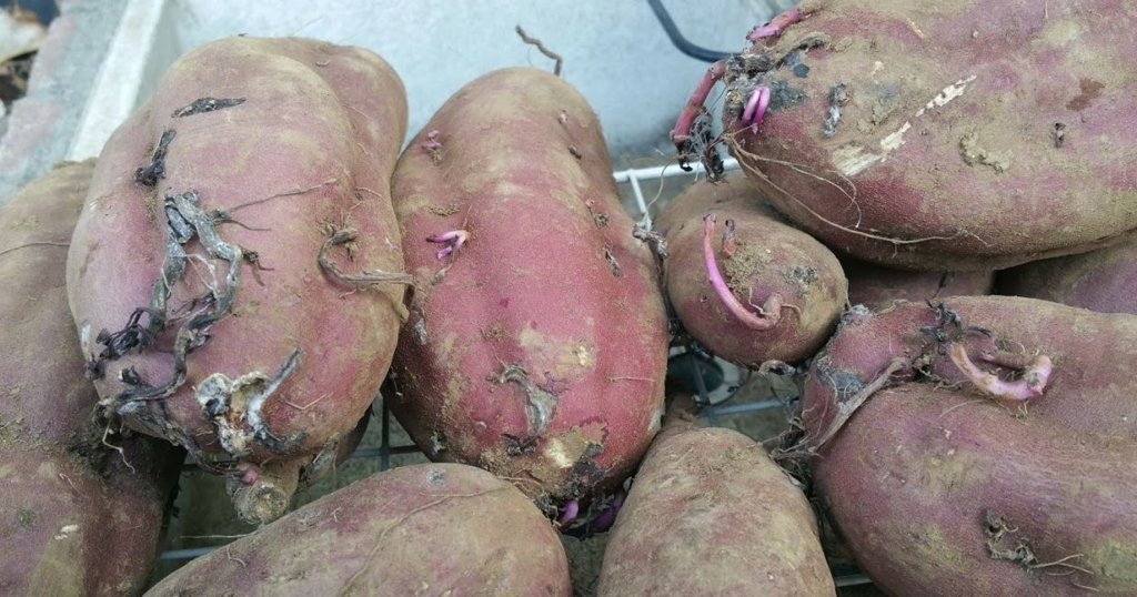 お芋をこたつ布団から出してよく見るとなんと枯れてしまった芽の横から新しい芽が出ていた。