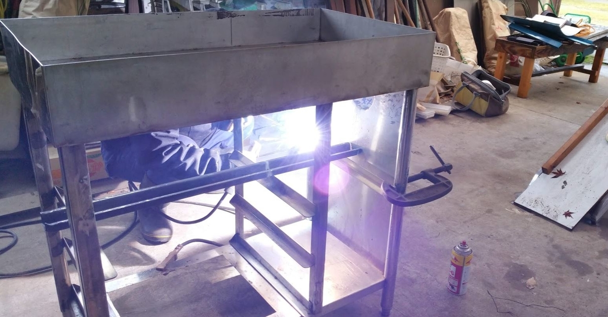 - ステンレステーブルにドラム缶の端切れを溶接する