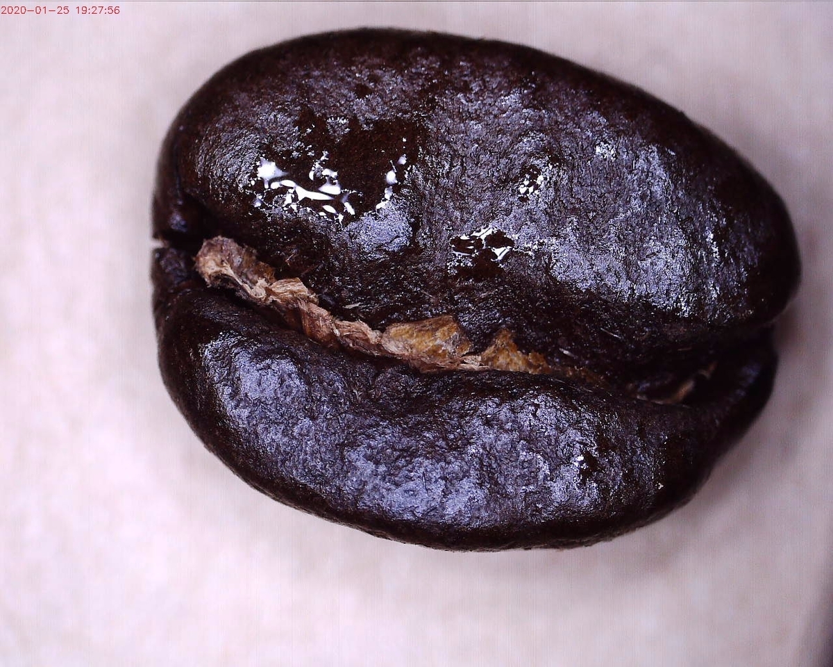 2020-01-25 焙煎記録 ンゴロンゴロ 品種:ンゴロンゴロ 推奨焙煎度はフルシティーロースト 焙煎ワンポイントは、 2ハゼピークよりやや早めに 専門店の焙煎サンプル 細かい部分を記録したいので マイクロスコープで拡大して観察してみた 味や香り、僕にはちょっと深い 表面に油がにじみ出ている 自家焙煎ではこれを基準に若干浅くしてみる 自家焙煎 ンゴロンゴロ シティーロースト 2ハゼの始まりで炒り止め